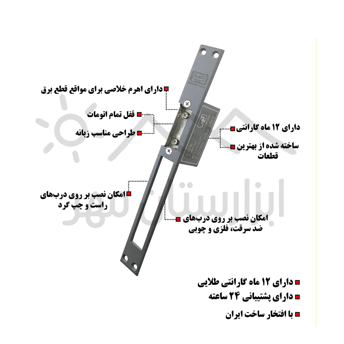 گروه صنعتی و تولیدی ابزار کهن یکی از مجموعه های فعال و معتبر در صنعت ابزارآلات و تجهیزات ایمنی بشمار می آید. گروه ابزار کهن با بهره جستن از تجربه چندین ساله و دانش فنی و علمی متخصصین خود همواره کوشیده است محصولاتی را با بهترین کیفیت تولید و در اختیار مشتریان محترم قرار دهد.قفل مقابل برقی وسیله است که از آن برای فرمان پذیر کردن درب ها استفاده میشود. این ابزار از بویین و یک قالب فلزی تشکیل شده است که به هم پیچ شده اند. روی بویین این قفل یک عدد زبانه قرار دارد که با هربار ولتاژی که به بویین آن اعمال میشود یک بار به حالت خلاصی می رود. بنابراین اگر قصد دارید درب ساختمان یا اداره خود را فرمان پذیر کنید راحتترین کار استفاده از قفل مقابل برقی میباشد.