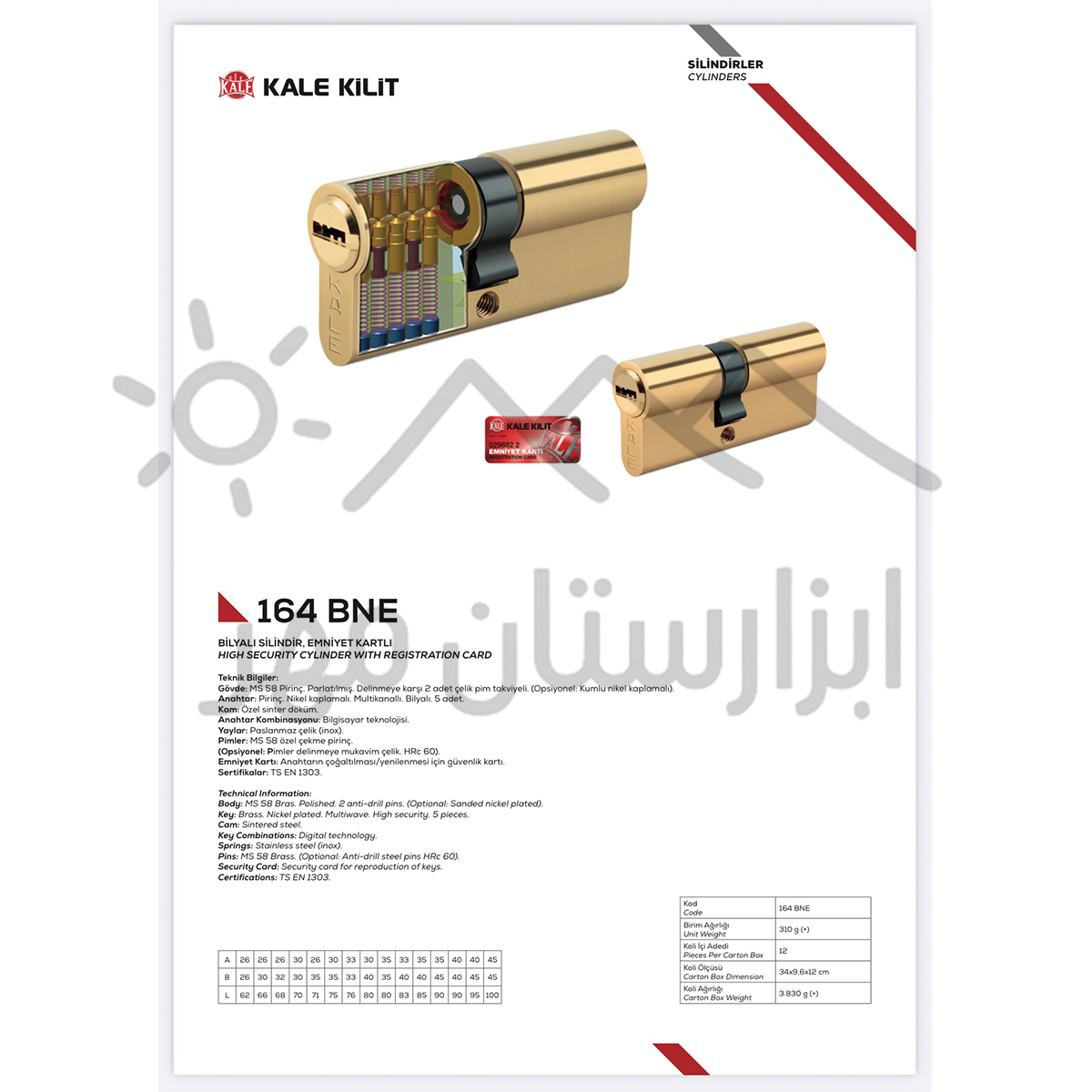 سیلندر قفل کاله ۱۶۴BNE محصول کارخانه کالی کلید ترکیه است . جنس بدنه مغزی و کلیدها هردو از فلز برنج آبکاری شده است برای تقویت مغزی دوطرف ان پین های فولادی قرار دارد که در مقابل مقابل دریل مقاوم است. مغزی قفل کاله دارای ۵ کلید کامپیوتری دو ردیف ساچمه است .